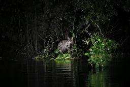 The specialization for fishing is seen in the partially-webbed toes of the front feet. The fishing cat uses these paws to scoop up fish. In addition, the cat sometimes gently taps the surface of the water with the paws to imitate insects – and then scoops the investigating fish. The species is known to be a strong swimmer. It is able to swim long distances, even in deep water. It can swim and pursue prey underwater, using its strong tail as a rudder. In addition to fish, the species will hunt waterfowl, frogs, small mammals, snakes, snails, crustaceans, and even birds.