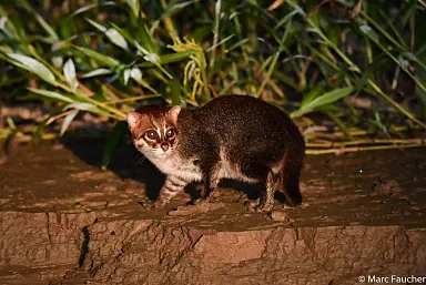 The flat-headed cat’s diet is dominated by fish, so it usually stays close to water. The species’ prey also includes frogs and shrimp. Rodents and domestic chicken are also taken at times. Flat-headed cats also consume fruit and sweet potatoes, the latter from plantations.