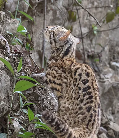 Diurnal in nature, leopard cats are also agile climbers and can be quite arboreal, hunting and resting comfortably at three to four meters off the ground. These cats feed on a variety of small prey, including mammals, lizards, amphibians, birds, and insects.