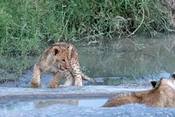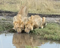 Lions at a watering hole. Photo courtesy of and copyright © Sharon Osberg of Wild World Foto. All rights reserved. Used with permission.