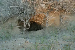 Single adult sand cat in burrow, at dusk in shrub semi-desert. © daveshowler · some rights reserved