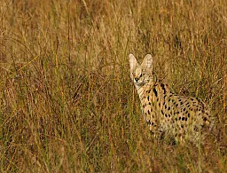 When under attack by potential predators, such as hyenas, the serval reacts by hiding or fleeing. This solitary, nocturnal cat is a specialized small-mammal catcher, catching rodents in tall grass and using its long legs and flexible feet to investigate holes and crevices. The serval also will eat birds, lizards, snakes, frogs, and insects.