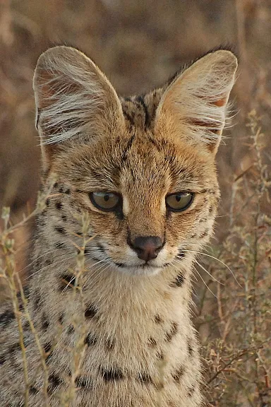 It has a small, slim face dominated by very large, oval-shaped ears. The serval’s coat markings vary in size from fine-freckled dots to large, distinct spots that sometimes merge into stripes on the neck and back. This cat is specialized for height rather than for speed, using its ability to hear and its long legs to capture small rodents in tall grass.