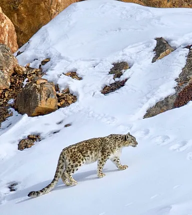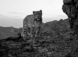 The snow leopard’s distribution lies in the high mountain regions of central Asia, ranging from 600 to nearly 5,800 meters. The species is a rock specialist and is usually found in rugged areas where the terrain is broken by cliffs, ridges, and ravines.